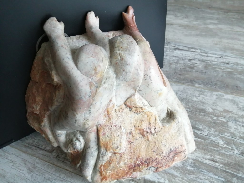 Het zou Braziliaans speksteen maar was harder dan ik had verwacht. Deze gestileerde man en een vrouw proberen uit alle macht de bedreiging van zich af te wenden. Een ideale en unieke boekensteun! H 17 cm x b 18 cm x d 19 cm, ong. 5 kg.
