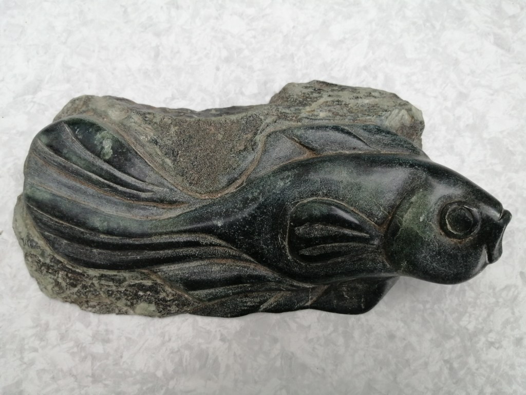 Bevroren in de tijd, een wat fossiel aandoende vis, gemaakt van donker serpentijn uit Brazilië. L 17 cm x b 9 cm x h 3 cm, < 1 kg.