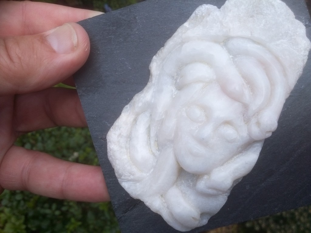 Een kleine Medusa, uit de Griekse mythologie. Volgens het verhaal jammerlijk onthoofd door de held Perseus. Gelukkig hebben we dit beeldje nog, van Chinees speksteen i.c.m. leisteen uit België. B 10 x l 10 cm x h 2 cm, ong. 300 gr.