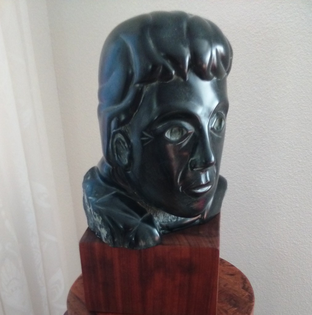 Een fors werkstuk, gemaakt van serpentijn uit Brazilië. En functioneel bovendien want het is bedoeld voor hoeden, mutsen en andere hoofddeksels. Het staat hem allemaal prachtig! H 30 cm x b 25 cm x d 22 cm, ong. 30 kg.
