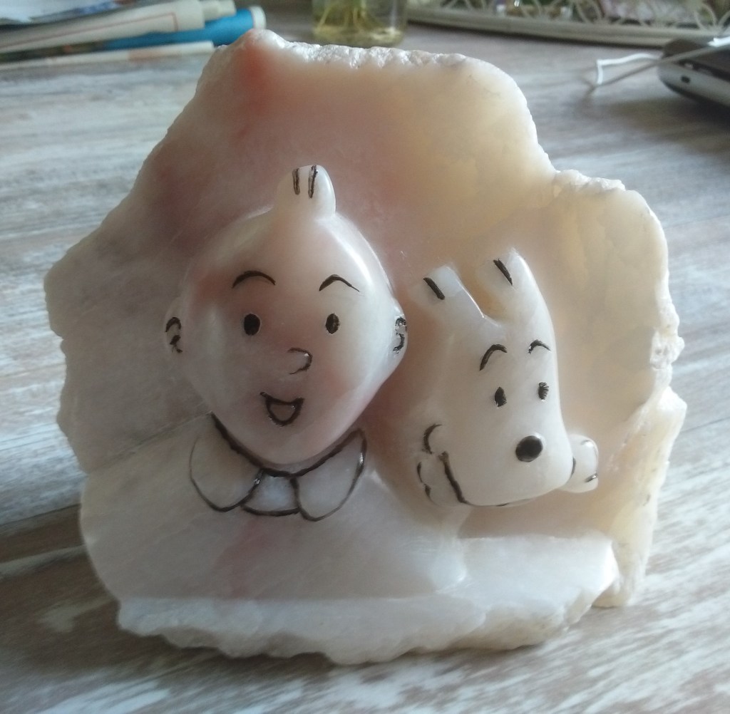 Tintin et Milou, Kuifje en Bobbie, de grote helden uit mijn jeugd van de grote kunstenaar Hergé. Met hen ging je op wereldreis en beleefde je de spannendste avonturen. Ik heb ze gemaakt van Chinees speksteen en de lijntjes geschilderd volgens de stijl van de “Klare Lijn”. B 12 cm x h 10 cm x d 6 cm, ong. 1 kilo.