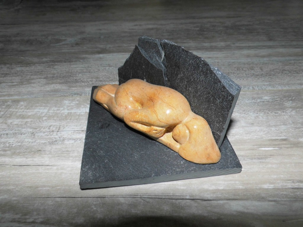 Het eerste van een drietal “femmes”, kleine beeldjes gemaakt van Braziliaans speksteen, bevestigd op leisteen. B 14 cm x l 14 cm x h 6 cm, ong 500 gr.