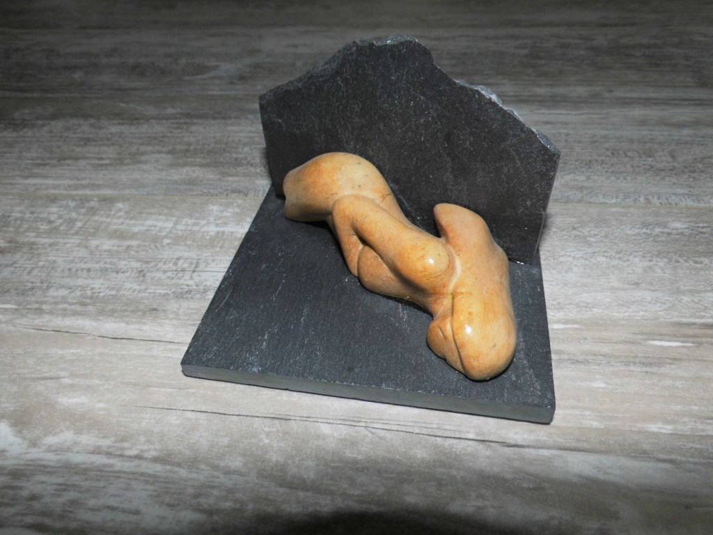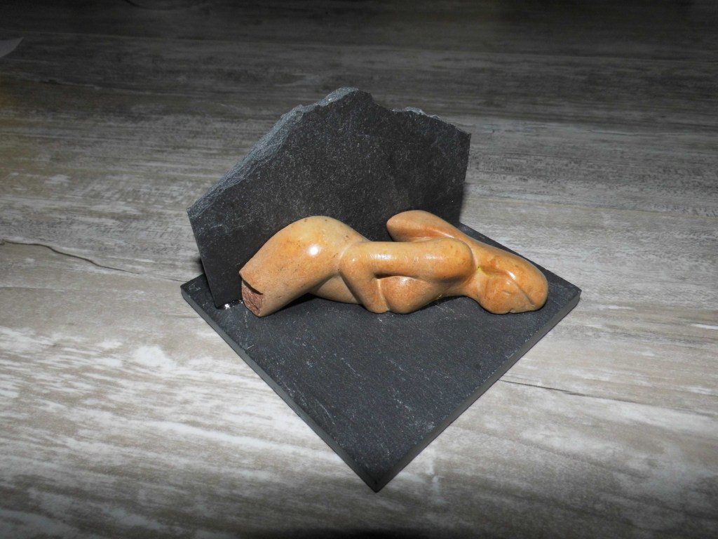 De tweede “femme”, in de stijl van de eerste. Ook nu weer de combinatie van Braziliaans speksteen en leisteen. B 14 cm x l 14 cm x h 8 cm, ong. 500 gr.