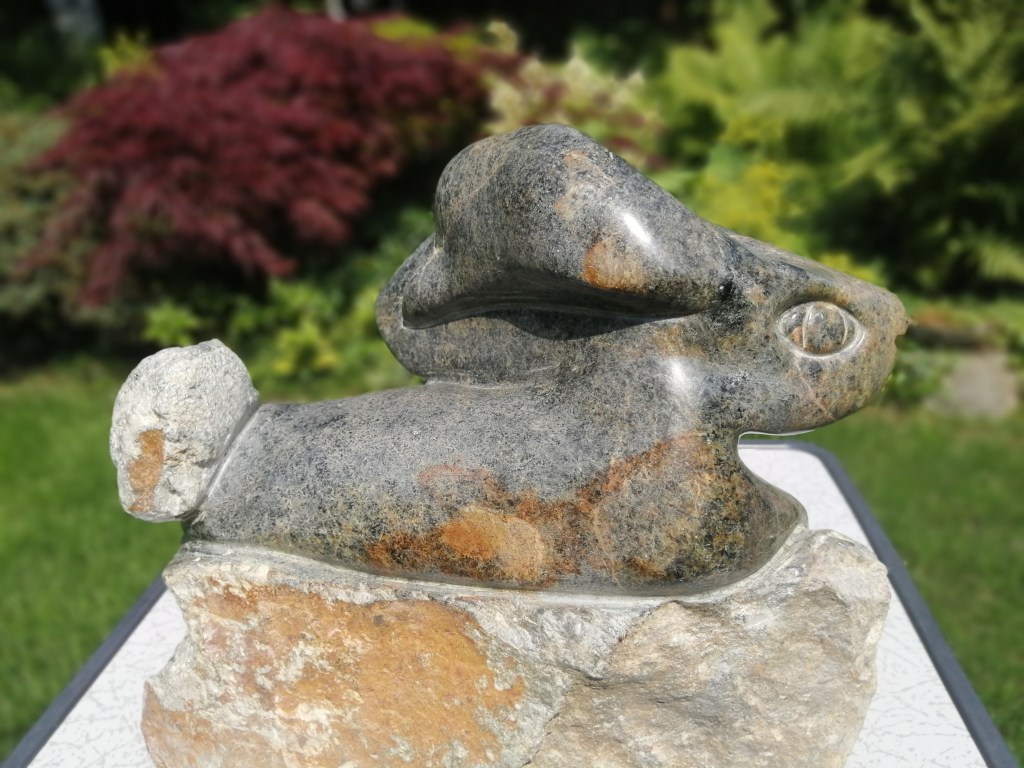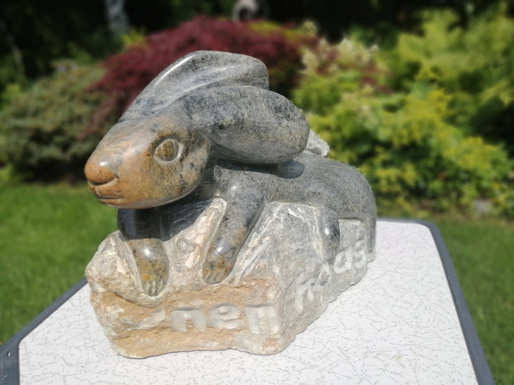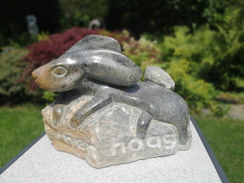 Een haas gemaakt van speksteen uit India. Hij heeft zijn weg gevonden naar mijn neef en tevens ook goede vrind Rens. Vanzelfsprekend ook ” ‘nen hoas”, hetgeen vanzelfsprekend oud Brabants dialect is voor “een haas”.