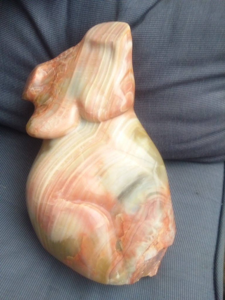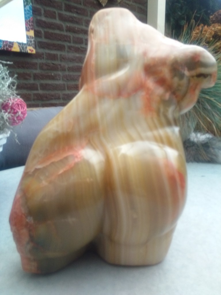 Een vrouwentorso van Mexicaans onyx. Dat is sowieso lastig te bewerken. De voor- en achterkant zijn in feite al aparte delen, “bodies”. Het derde deel is op de foto’s niet te zien. Waarom zou een torso er immers altijd hetzelfde uit moeten blijven zien? Leve de verrassing, nietwaar? Prachtige kleuren variërend onder het zonlicht. H 34 cm x b 24 cm x d 16 cm, ong. 20 kilo.