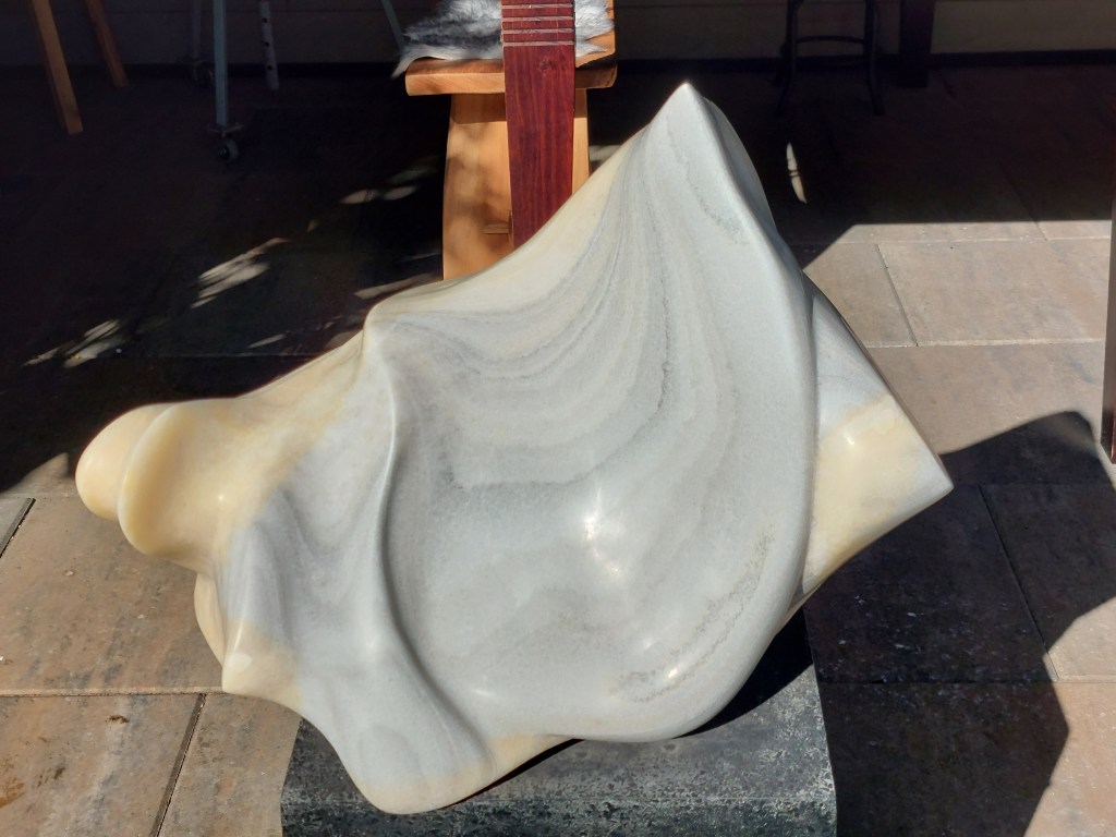 Deze abstracte golf van Mexicaans onyx zou nog veel meer namen kunnen hebben, Het kan op diverse wijzen geplaatst worden en is mede daardoor erg verrassend. Let op de schitterende lijnen van de diverse lagen in de onyx. Op sommige plekken enigszins transparant als de zon schijnt. B 57 cm x h 38 cm x d 34 cm, ong. 50 kg.