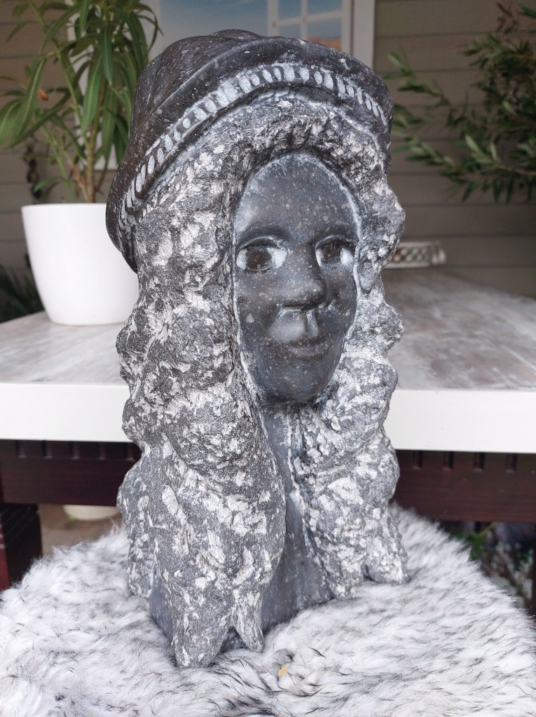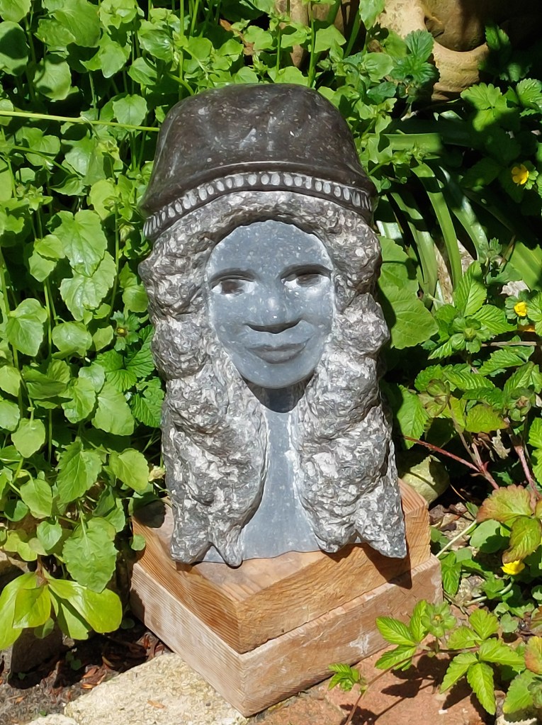 Mijn neef gaf me een rechthoekig blok Arduin. Aan die harde Belgische steensoort had ik nog gemengde gevoelens (zie “3. Stormwind”). Het verging me nu, met betere beitels, echter een stuk beter. Mijn lieve nichtje Marinelle was blij met deze “Eternal Woman”, die goedgemutst en vol zelfvertrouwen de wijde wereld in blikt.