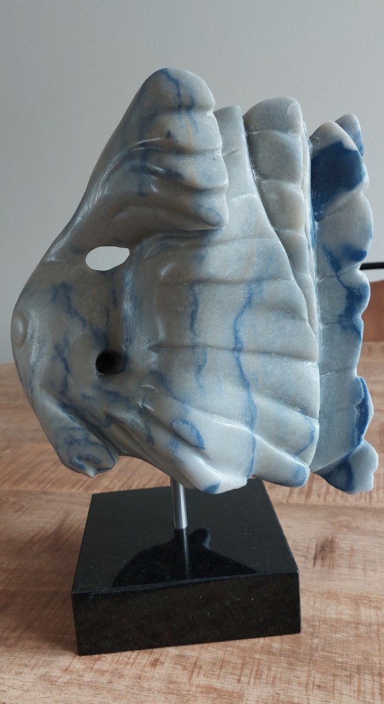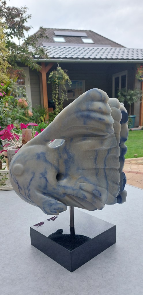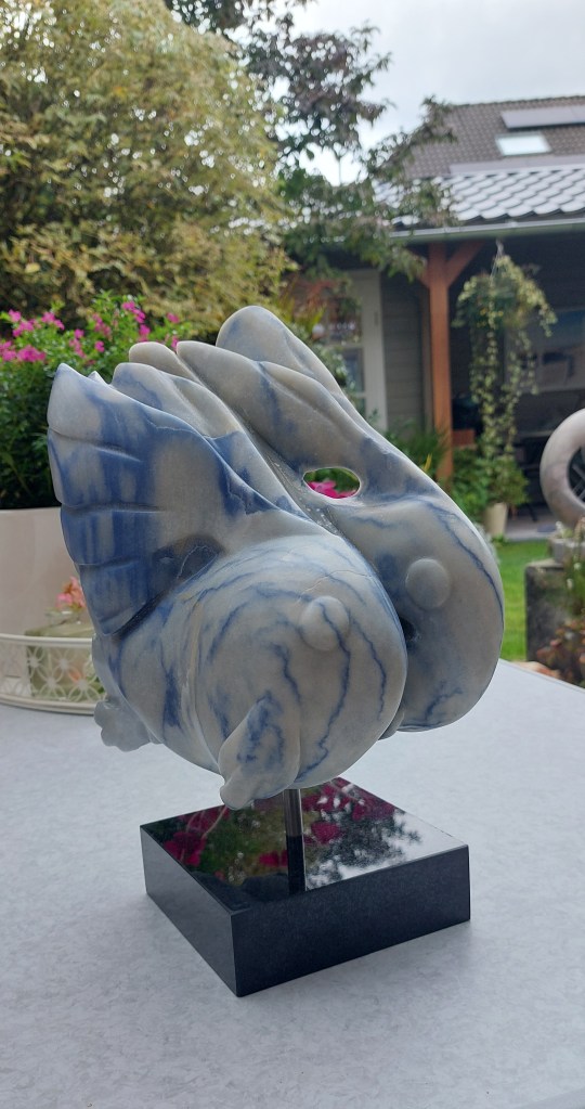 Het brok marmer, genaamd “Azul de Macaubas”, bevatte 2 boorgaten. Die moesten op een of andere manier verwerkt worden in het beeld. Het is uiteindelijk gelukt via het concept “Franjestaarten”, mijn eigen vissensoort. De steen bood prachtige blauwe strepen, passend bij het geheel. De nieuwe eigenaar heeft het ook een educatieve doelstelling gegeven.