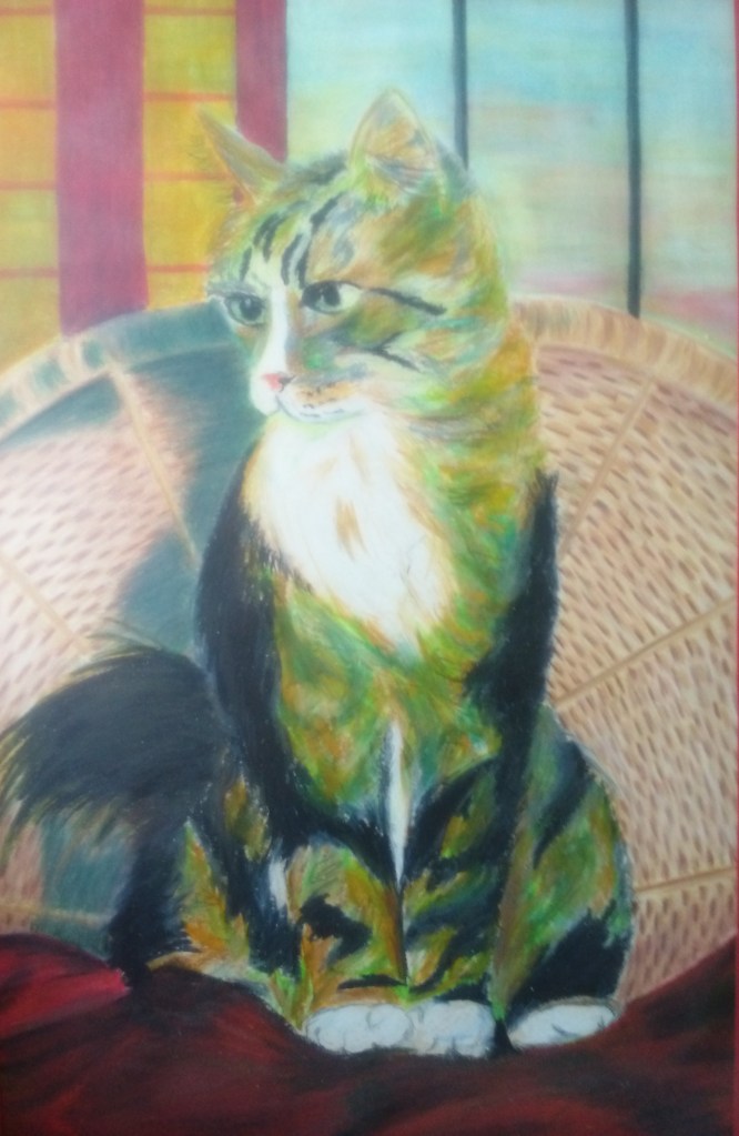 Gewoon een opdracht uit mijn schooltijd: maak een illustratie met vetkrijt. Het werd deze groene kat. Gemaakt in een luttel tijdsbestek. Het plakkerige vetkrijt is niet mijn favoriet. In die zin dus een uniek werkstuk. Papier, h 45 cm x b 30 cm.