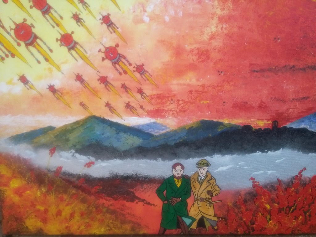 Geen stripliefhebber zonder “Blake en Mortimer”. De geestelijk vader, Edgar P. Jacobs heeft helaas slechts 12 albums gemaakt. Goed werk heeft evenwel tijd nodig. De latere albums, gemaakt door diverse gerenommeerde illustratoren en scenario schrijvers hebben naar mijn idee Jacobs’ niveau nooit geëvenaard. Dit schilderij is vrij naar “Het raadsel van Atlantis”, een geweldig album. Canvas, h 50 cm x b 70 cm x d 2 cm.