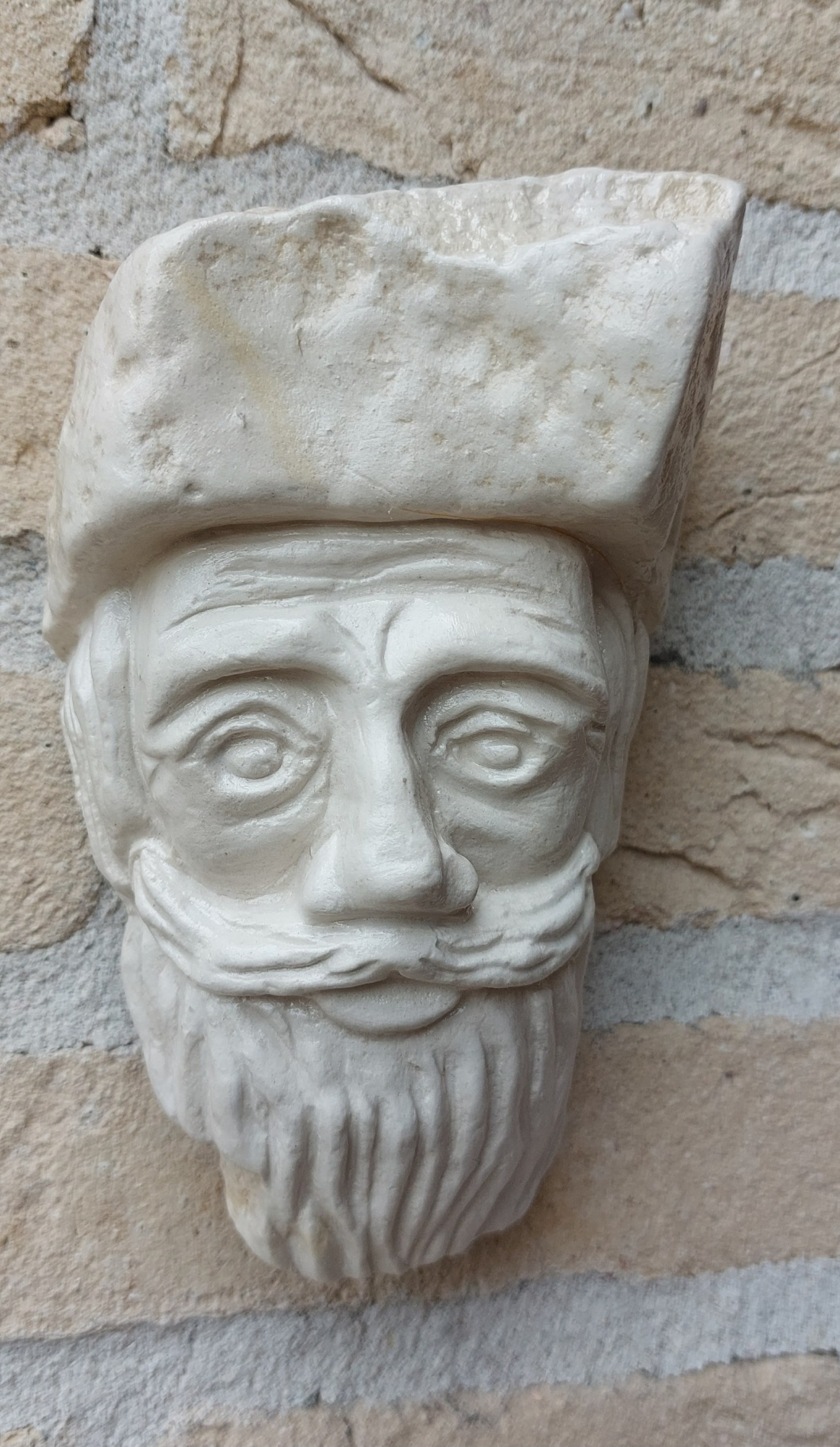 Het lijkt een groot beeld op de foto. Dat is het evenwel niet. Het ego van de man is echter onevenredig groot. Gemaakt van broos Frans kalkzandsteen. Het is desalniettemin een geschikt ornament om aan de muur te hangen. H 17 cm x b 12 cm x d 7 cm, ong. 500 gr.