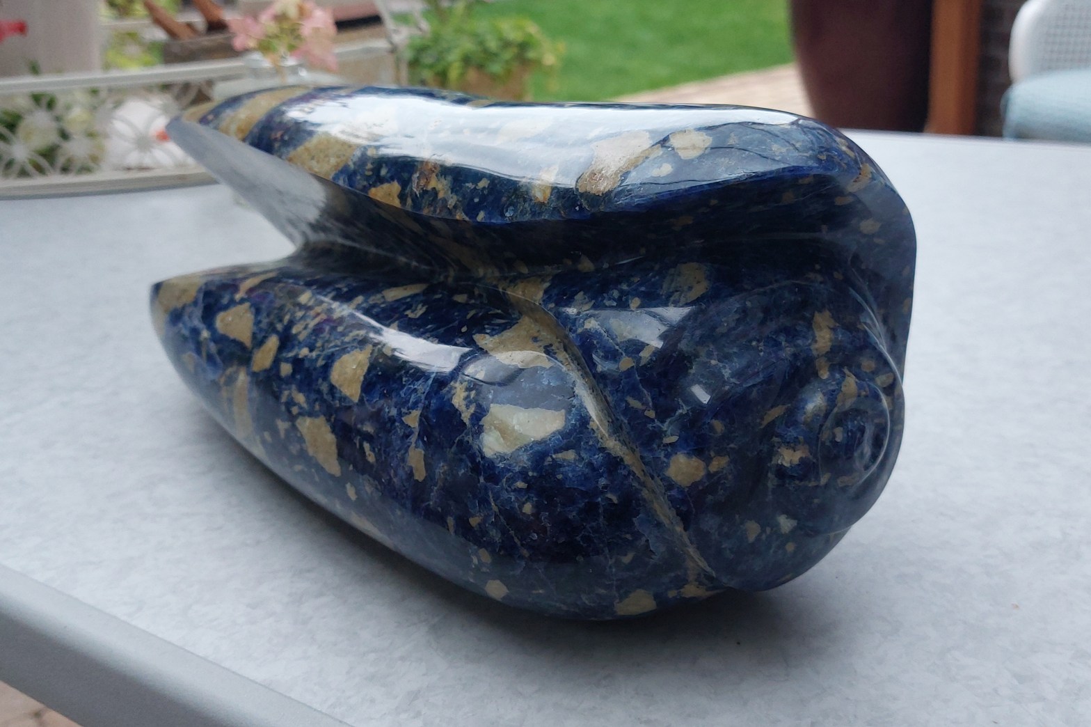 Sodaliet, klaarblijkelijk een half edelsteen, en daardoor waarschijnlijk met als toevoeging “Blue Royal”, is best hard en lastig te bewerken. Een mooie olijf schelp die ik in mijn jeugd al bewonderde bracht me op het idee om er zelf een te maken. Maar dan wel op mijn manier….de “Oliva Cuppensky”, met een knipoog naar BankskyMeerMeer lezen over “38. Oliva Cuppensky.”