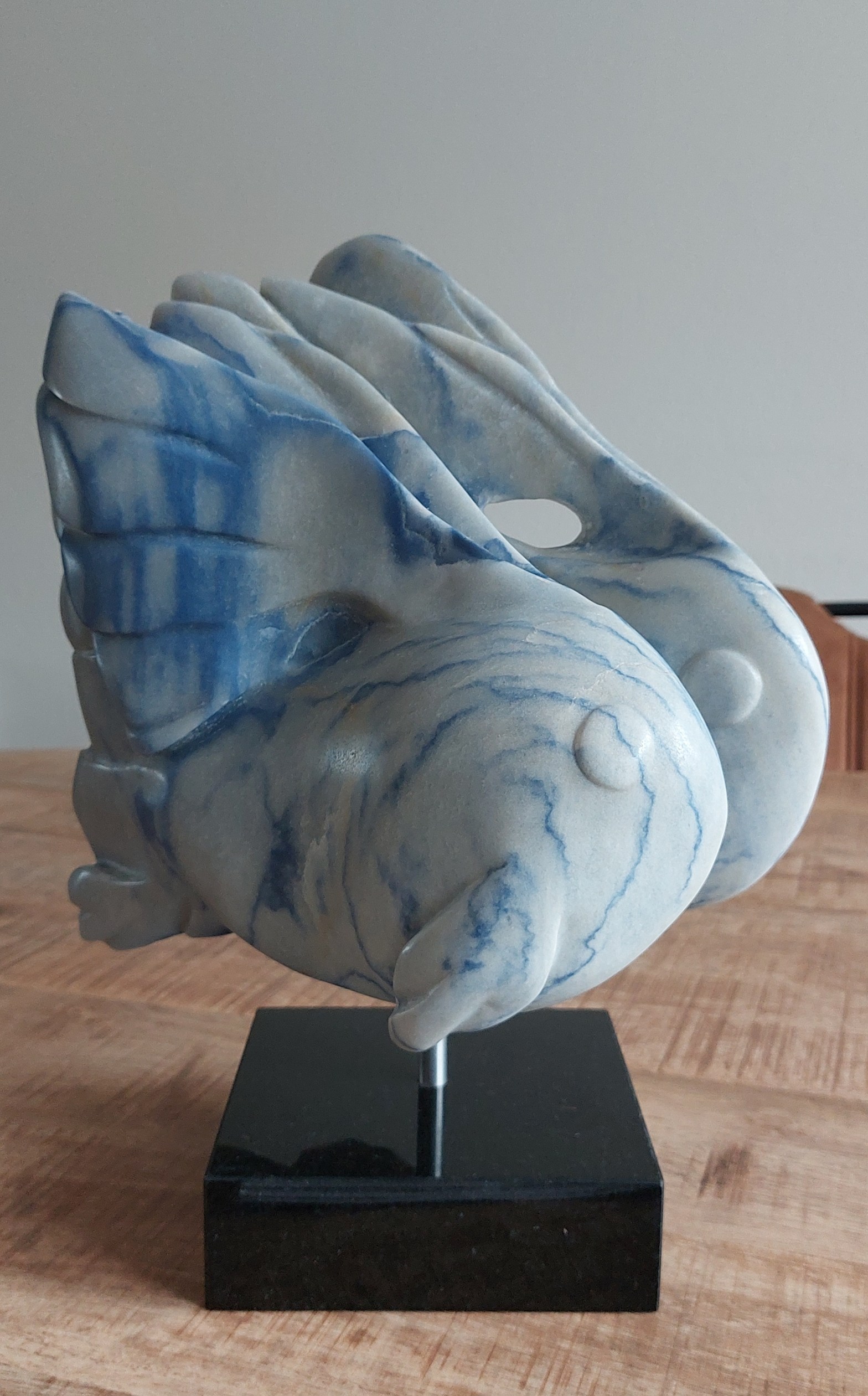 Het brok marmer, genaamd “Azul de Macaubas”, bevatte 2 boorgaten. Die moesten op een of andere manier verwerkt worden in het beeld. Het is uiteindelijk gelukt via het concept “Franjestaarten”, mijn eigen vissensoort. De steen bood prachtige blauwe strepen, passend bij het geheel. De nieuwe eigenaar heeft het ook een educatieve doelstelling gegeven.
