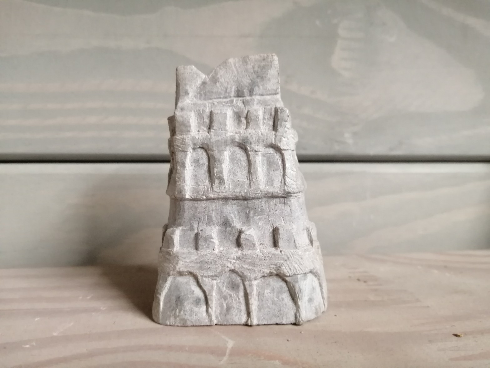 Deze kleine ruïne is de eerste en duidelijk vervallen oude toren van het nog te completeren schaakspel. Braziliaans speksteen. H 7 cm x b 7 cm x d 3 cm, ong. 200 gr.