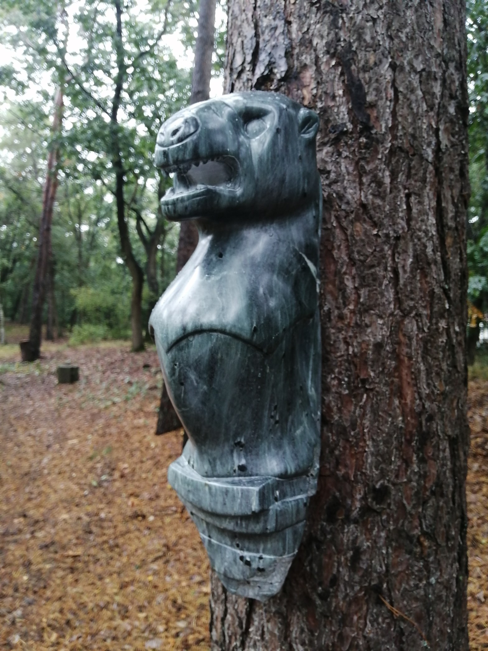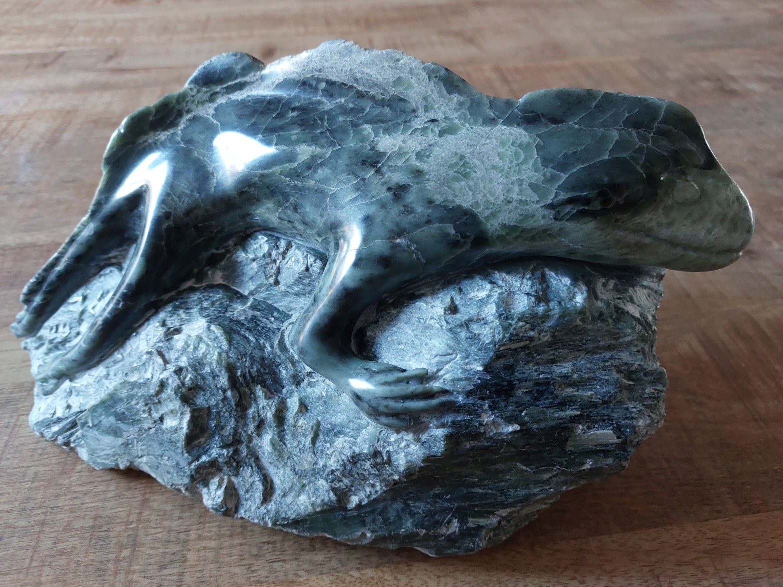 Kruiperig vond ie zijn weg, dit gladde en goed gecamoufleerde reptiel. Het is een zwaar maar kwetsbaar beeld geworden, gemaakt van speksteen. De steen was brokkelig en moeilijk te bewerken. De nieuwe eigenaars waren ook gefascineerd door de bijzondere kleuren.