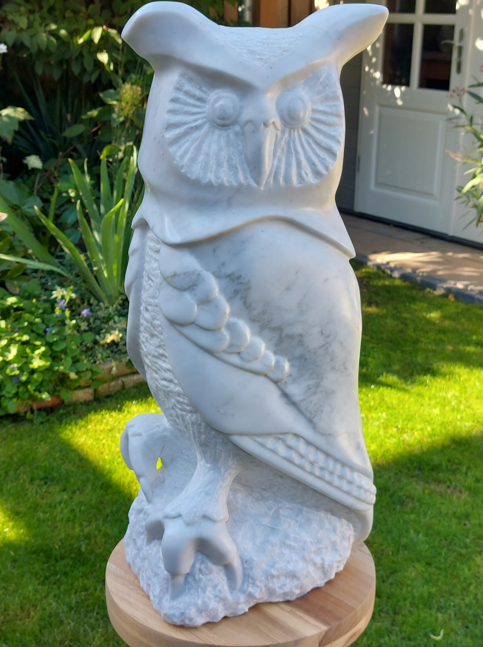 Deze flinke sneeuwuil van wit Italiaans Carrara marmer met her en der een grijs vlekje blikt met een zekere trots en uiteraard wijsheid de wijde wereld in. Scherpe klauwen en 55 kilo schoon aan de haak…. Wie doet me wat??? H 57 cm x b 24 cm x d 17 cm.