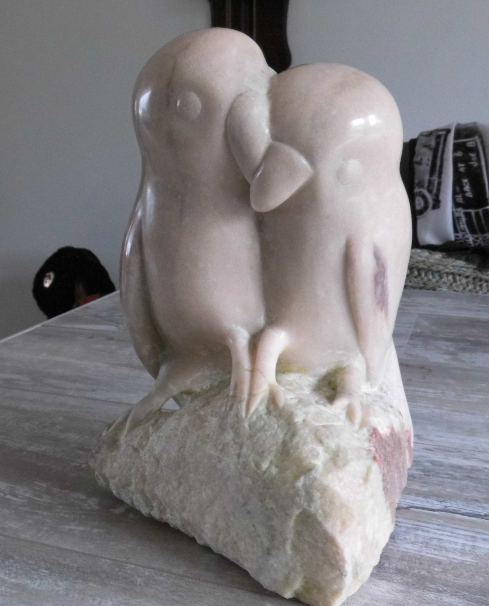 Twee “Love Birds”, oftewel Agapornis, gemaakt van Portugees marmer. Als voorbereiding had ik een klein beeldje van klei gemaakt. Dat werkt prima. Zippy en Kwiebus vlogen uit naar de lieve eigenaren van deze kwebbelende rakkers.