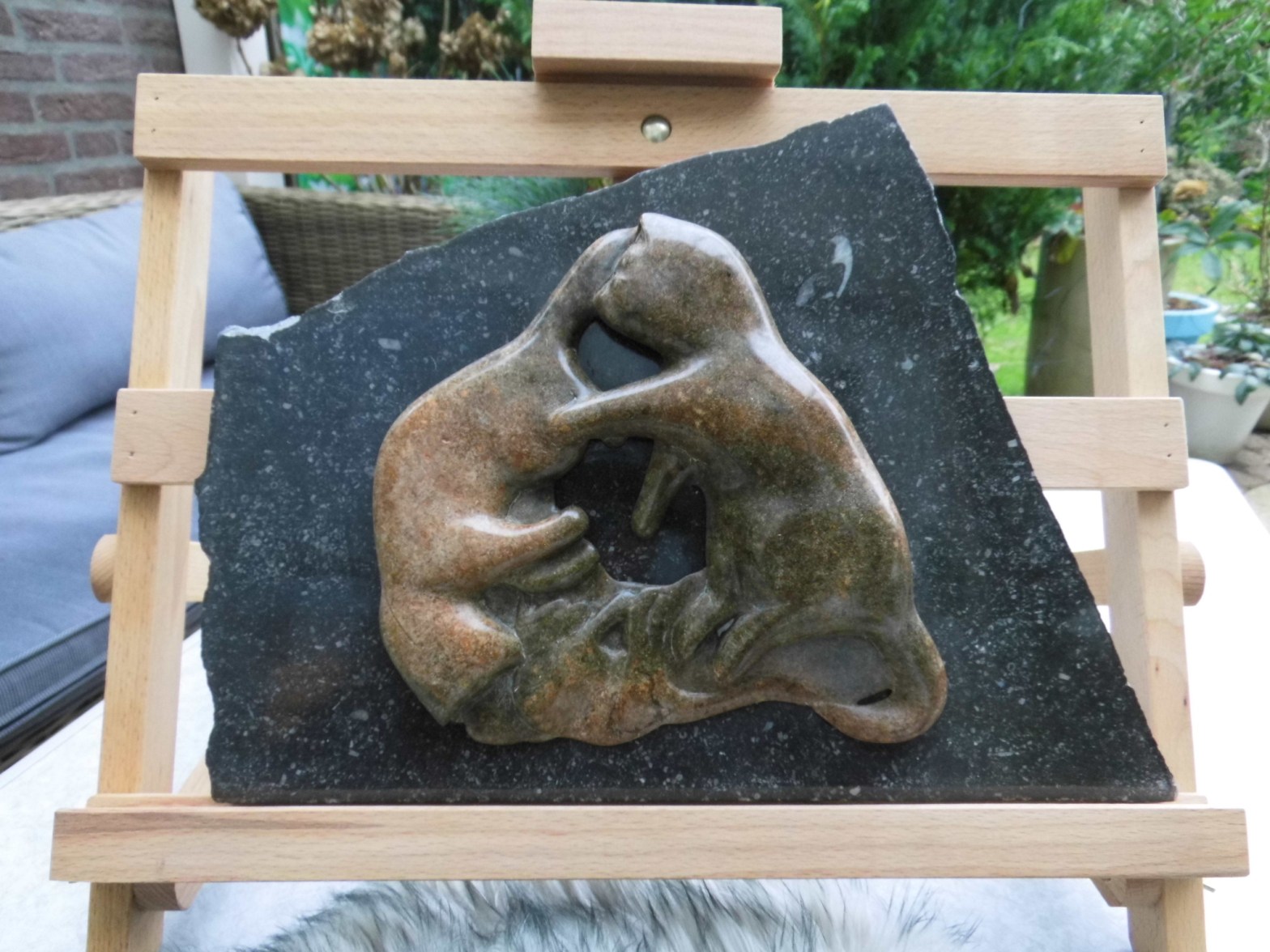 Katten spelend in reliëf. Het materiaal is Braziliaans speksteen, de ondergrond Arduin, oftewel Belgisch hardsteen. B 37 cm x H 26 cm x d 5 cm, ong. 3 kg.