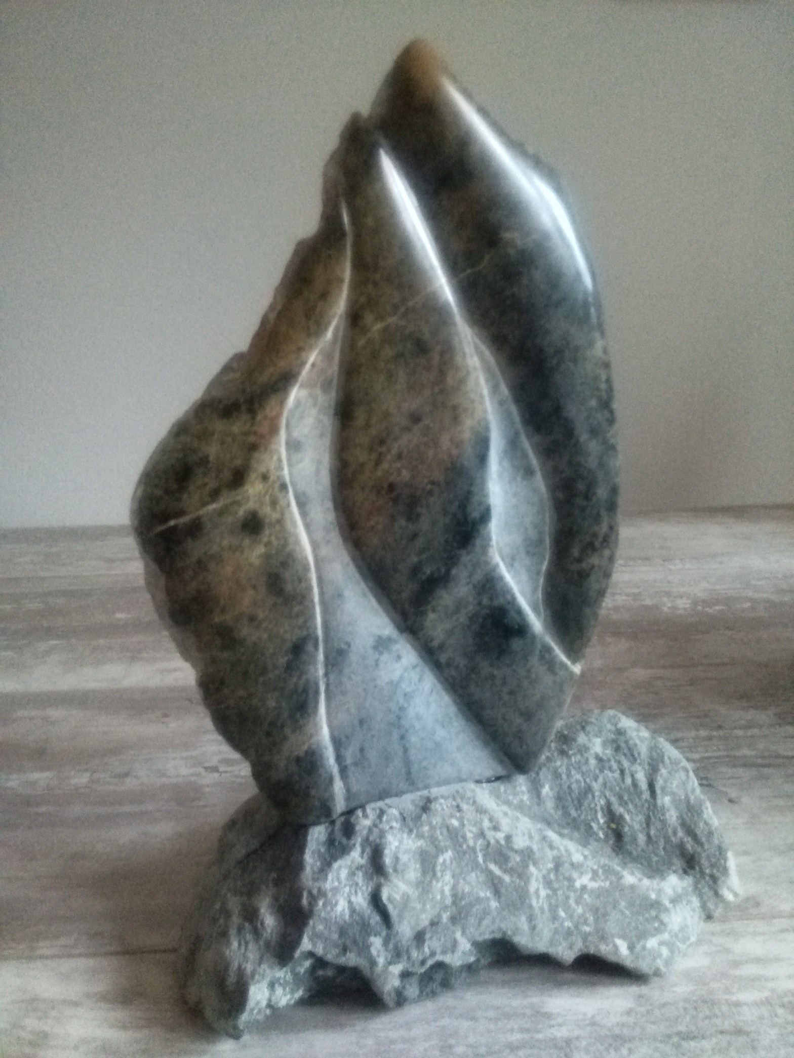 Wat kun je maken als je pols gebroken is? Dit vlamachtige beeld is van Indiaas speksteen en was prima te bewerken. Het staat in een houder van Braziliaans serpentijn. H 26 cm x b 20 cm x d 10 cm, ong. 2 kilo.