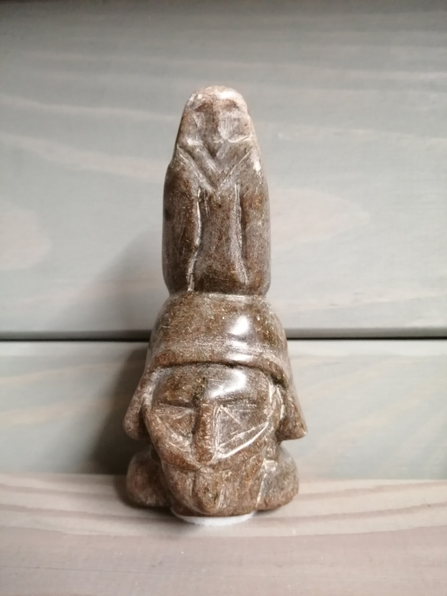 Wederom een kleine “loper”. En waarom zou het geen soldaat kunnen zijn met een uil op zijn hoofd? Een symbool van wijsheid toch, passend bij het schaakspel?! Fantasie laat alles toe, ook in Braziliaans speksteen…. H 10 cm x b 4 cm x d 4,5 cm, ong. 300 gr.