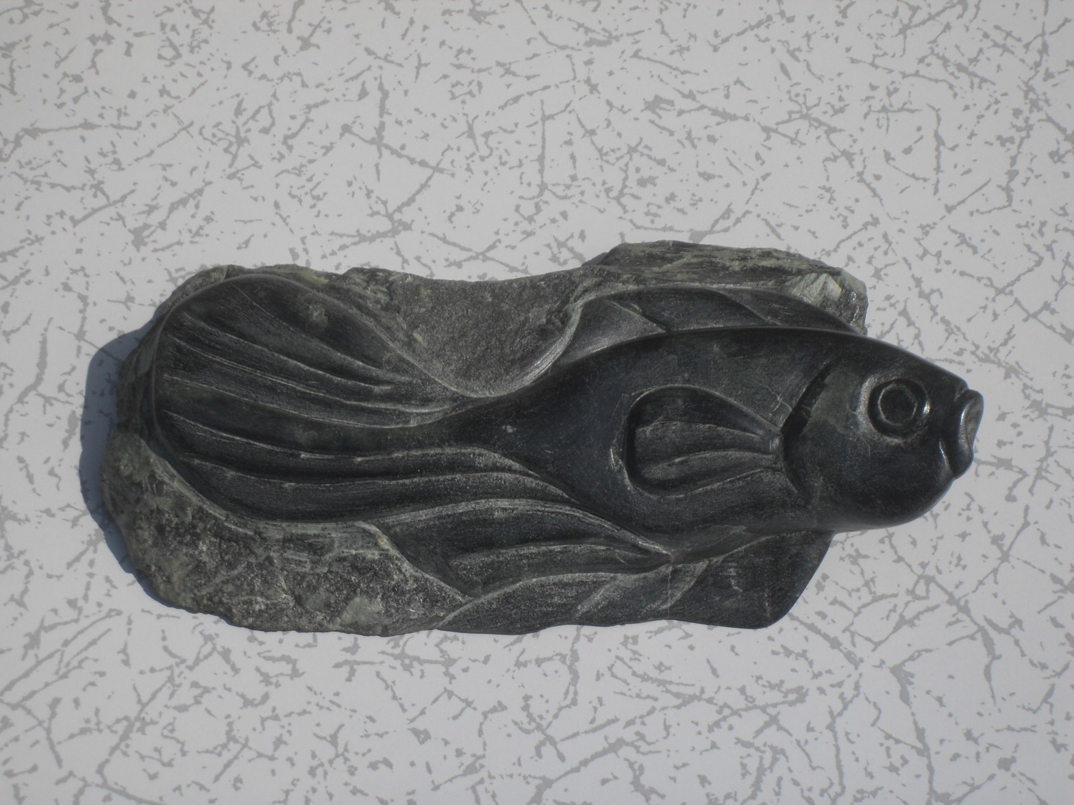 Bevroren in de tijd, een wat fossiel aandoende vis, gemaakt van donker serpentijn uit Brazilië. L 17 cm x b 9 cm x h 3 cm, < 1 kg.