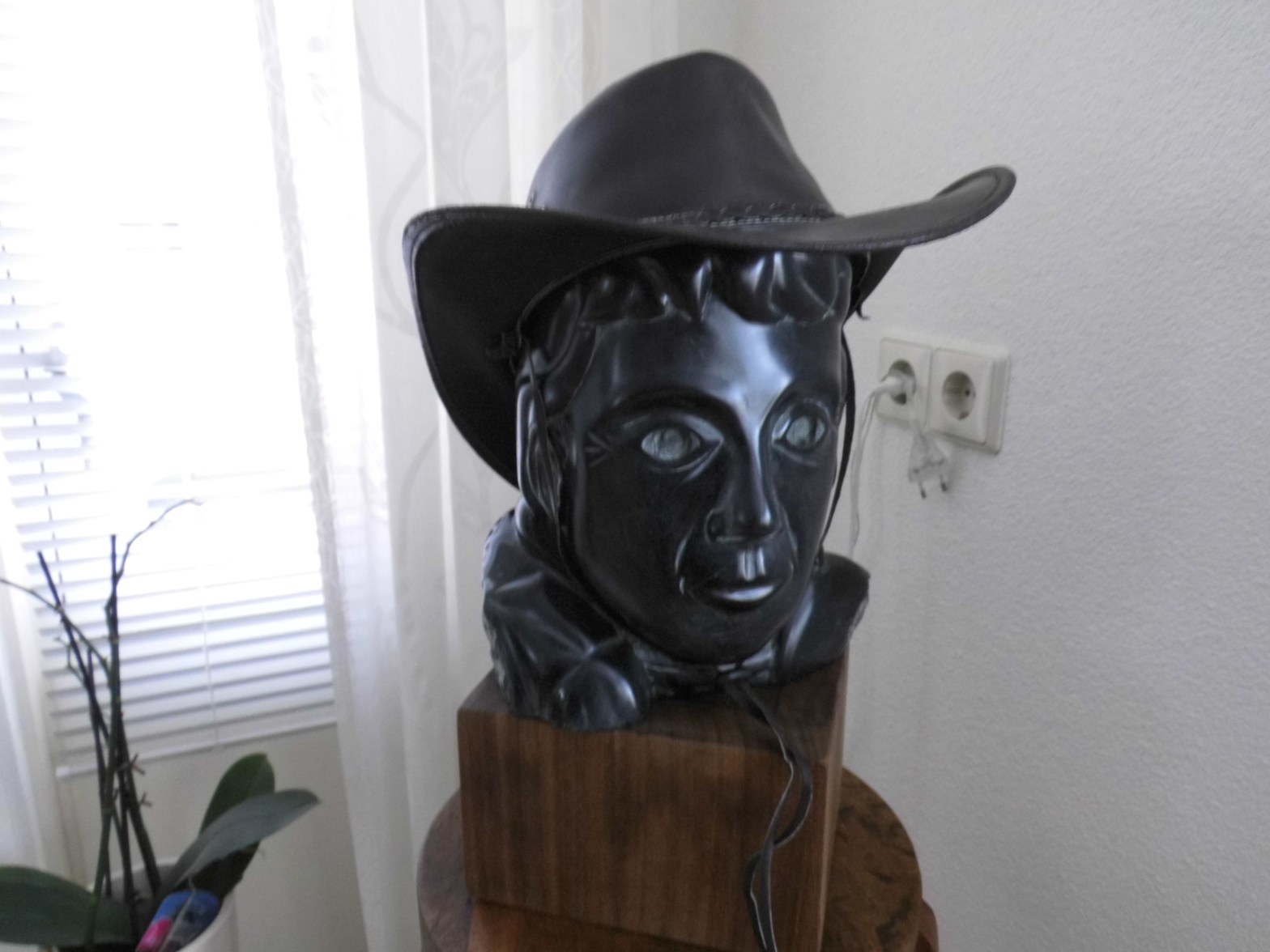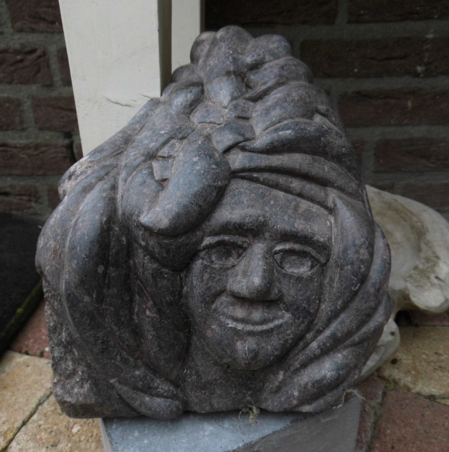 Een fors werkstuk, gemaakt van serpentijn uit Brazilië. En functioneel bovendien want het is bedoeld voor hoeden, mutsen en andere hoofddeksels. Het staat hem allemaal prachtig! H 30 cm x b 25 cm x d 22 cm, ong. 30 kg.